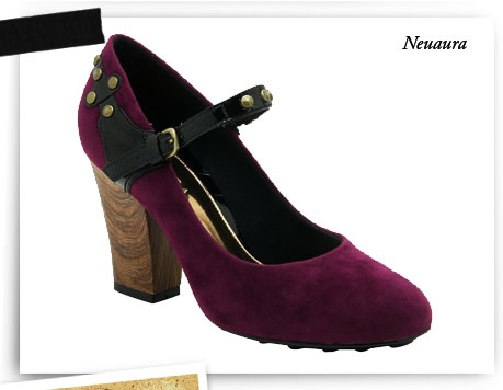 Between the chunky heel shape, luggy sole and studded faux-patent ankle strap, this velvet shoe delivers both comfort and a traffic-stopping look. "We always try to keep a balance between being trend-right and timeless with all our designs," says Neuaura designer Arti Upadhyay. She notes her fall collection encompasses varied silhouettes made with natural materials (such as linen and fabric hybrids) as well as satin and imitation leather. The line is completely animal-free, but still walks on the wild side with touches of leopard print. www.footwearplusmagazine.com